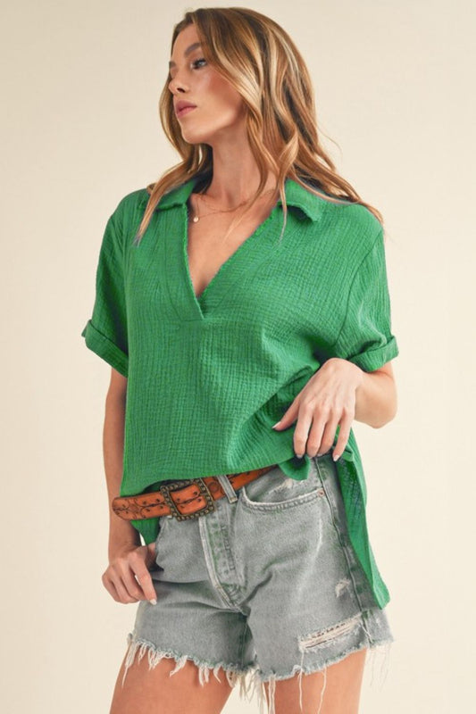 Side Slit Johnny Collar Short Sleeve Cotton Gauze Blouse
