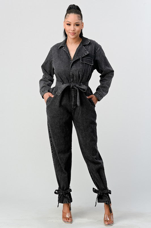 ATHINA BLACK WASHED DENIM TIE DETAIL JUMPSUIT